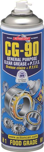 CG90-FG H1 food grade high temperature clear grease with PTFE has a wide temperature operating range rated to -45C + 350C. CG-90 holds H1 approval from NSF and InS. Non toxic, no odour, multi viscosity, water and steam resistant and with added corrosion inhibitor. Size: 500ml Aerosol.