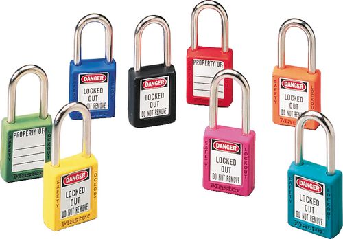 Non-conductive, non-sparking reinforced nylon with a hardened steel shackle, to produce a padlock that is impact resistant and chemical and corrosion resistant. The key will not release until the shackle is closed. Patented insulated key chamber to protect workers from shocks when the key is inserted.