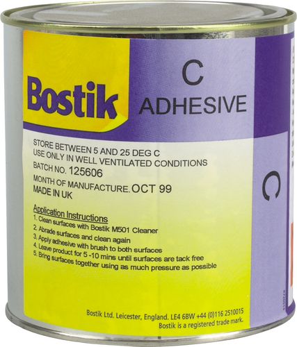 Bostik ?C? adhesive is a black natural rubber, solvent borne general purpose adhesive. For use on rubber, linoleum, cork, felt, wood, metal and concrete. Heat resistant up to 70C and can be used in two way dry film contact application or one way wet film application.
