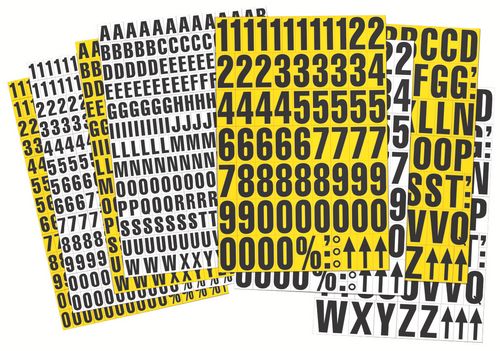 Magnetic tiles supplied on sheets as a combination of mixed alpha or numeric digits. Two tile heights, either 43mm with a 39mm high digit or 23mm with a 17mm high digit. Available with black digits on a white or yellow background. Allows for fast and easy labelling on any steel surface.