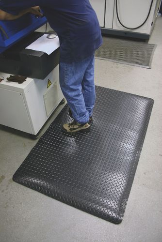 Resistant to many industrial chemicals. Diamond surface provides greater traction with extended wear and can be easily cleaned. Foam backed designed to relieve operator fatigue. Bevelled edges to prevent accidents and allows easy access for trolleys. Supplied on a roll. Thickness: 14mm. Colour: Black only.