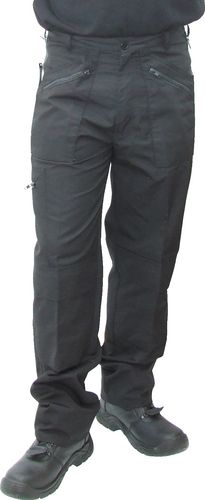 Manufactured from durable poly-cotton material and have double stitched seams and hard wearing reinforcing patches on the seat. Nine multi-sized pockets: two side, two front, one leg and two back pockets - all zipped along with two open front pockets. Knee pad pockets with flap and top access. Button fastening with zipped fly and belt loops.