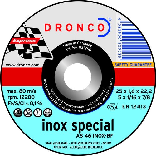 The special line for craftsmen and industrial applications. Due to the fact that different materials impose different demands, DRONCO produces discs especially matching the respective material. Special types of corundum and bonds are combined to suit the task in hand. This optimises performance, extends service life, increases efficiency and reduces cutting time. Manufactured according to EN 12413. Complies to oSa regulations.