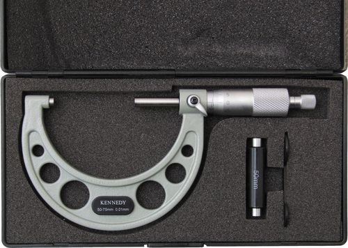 Kennedy® Enamelled Frame External Micrometers for taking external measurements accurately. The alloy steel spindle is held rigid in a drop forged steel frame and is fitted with a speeder type ratchet thimble for rapid adjustment and a fine adjustment thimble for taking precise measurements. The spindle can be locked in position by the using the spindle lock lever this retains the spindle position for reference. The anvils are optically flat tungsten carbide for a hardwearing contact surface that ensures precise measurements every time. Manufactured to BS 870.