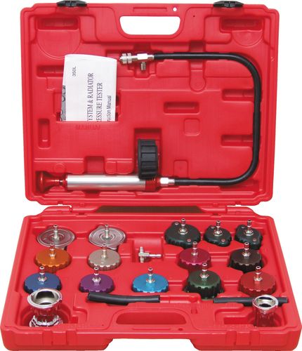 Contents: 14 radiator pressure testing caps, for use in testing cooling systems for leaks. Two cap adaptors, sizes 2-3 and 4-5, for testing radiator cap release pressure and seal condition. Two 200psi coolant hoses (5/16" and 3/8"), for use with T-adaptor for in-line pressure testing. T-adaptor for creating in-line pressure testing set-up. Two 3/4" hose clips.