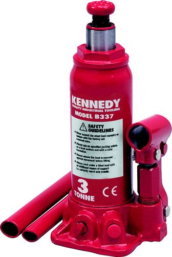 Kennedy Hydraulic bottle jacks have large cast iron bases with a steel housing and lift cylinder, that has an adjustable notched load saddle. Each jack is fitted with an overload protection valve. Two piece pumping handle also operates hydraulic release.
