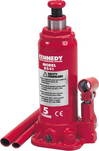 Kennedy Hydraulic bottle jacks have large cast iron bases with a steel housing and lift cylinder, that has an adjustable notched load saddle. Each jack is fitted with an overload protection valve. Two piece pumping handle also operates hydraulic release.