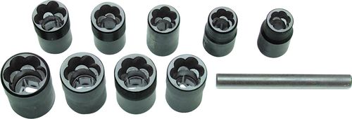 Extracts rounded, seized or painted right hand threaded fasteners, the reverse spiral flutes are designed to bite into seized nuts and bolts providing greater grip for extraction. The socket bar is to drive out the fasteners from sockets, once removed.
