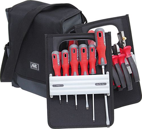 Manufactured from heavy-duty tear-resistant material with reinforced stitched edging. Velcro fastening flap with soft touch carry handle and double webbed shoulder strap, fixed with metal release clasps. Supplied with two small organiser cases which are stored in two outer pockets. Two removable tool boards (one velcro fastened) are kept inside which have a unique built-in tool storage securing system.