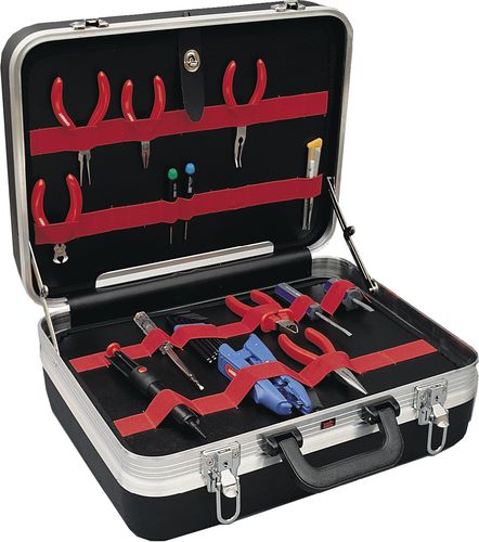 Impact resistant case. Two removable tool boards with elasticated tool retaining loops, one with document pocket, divided storage compartment. Double locking with two keys. Tools not included.