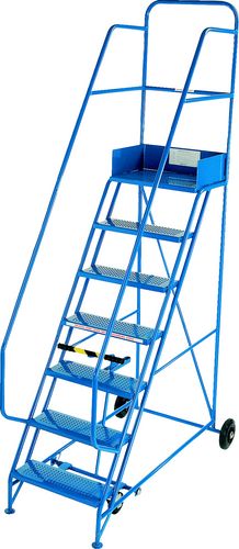 Fully welded rigid construction, manufactured from 25mm tubular steel. All steps are fitted with two retractable front castors which are lifted from the floor by use of a centrally mounted No Access Barrier retractor handle; allowing the two large steel feet to impact on the ground to give maximum stability to the operator. The large sized top platform with kicking flat (not available on 5 & 6 tread steps) makes order picking/shelf access or maintenance both comfortable and SAFE.