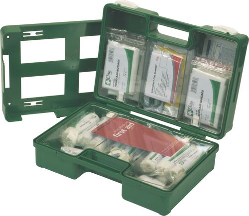 Contents: 1x guidance leaflet, 40x individually wrapped sterile plasters, 4x no.16 sterile eye pads, 6x triangluar bandages, 12x safety pins, 9x medium sterile dressing 120 x 120mm, 3x large sterile dressing 180 x 180mm, 10x alcohol free cleansing wipes, 2prs disposable gloves. Also supplied with 1x emergency foil blanket, 1x microporous tape (25mm x 10m), 1pr scissors, 2x steropore dressings (60 x 70mm), 2x low adherant pads (75 x 75mm), 1x personal protection pack (apron, gloves, disposable bag, resusciade, wipe).