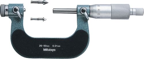 Interchangeable V-anvils allow various pitches to be measured with a single micrometer. With ratchet stop. Accuracy: 0-75mm /-4 mu m, 75-100mm /-5 mu m. Anvils supplied separately.