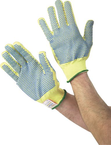 Lightweight 13 gauge 100% kevlar glove. Retains excellent dexterity for assembly work. protects against cuts from sharp edges. Seamless, ambidextrous, comfortable and washable. Suitable as a liner glove for chemical resistant gloves. Polka dot pattern for good grip and safe handling. Not suited to heat hazards as the polka dots can melt. CE - intermediate design.