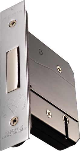 Kitemarked to BS3621. Insurance approved sashlock, easily reversible latchbolt, five detainer mechanism, 76mm (3`) case size. Supplied with square or radius forend and strike. Supplied with two keys. Satin chrome plate finish.