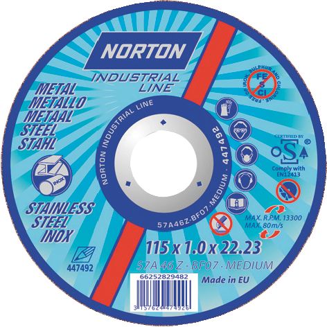Advanced grain and bond system for longer life and quicker cutting. Suitable for steel and stainless steel applications. Free from iron, sulphur and chloride. For use with portable angle grinders. Type 41 (flat).