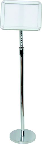 Lightweight frames for indoor or outdoor use. Attractive cushion profile' frames made from smooth satin finish Aluminium. A clear flexible plastic front sheet protects the contents from dust and contact. Height adjustable tubular steel stand features a ratchet slider machanism to allow rapid adjustment. Mirror chrome finish. Ideal for use in lobbies, receptions or as a temporary traffic direction sign. Height range 1050mm - 1450mm. Base diameter 245mm. Weight 2.5kg.
