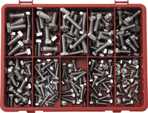 Contents: M6 x 12, M6 x 16, M6 x 20, M6 x 25, M8 x 20, M8 x 25, M8 x 30, M10 x 25 and M10 x 20. Average quantity: 200.
