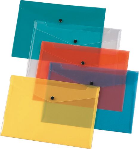 A stylish and colourful way to store and carry documents. Hard wearing, low-cost polypropylene document folders. Transparent with a press-stud closing mechanism to keep contents secure.