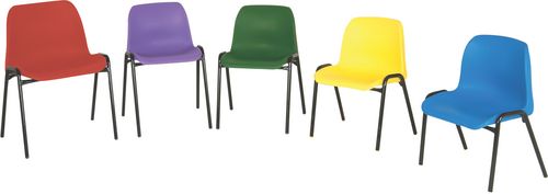 Tough, moulded, textured seat with black epoxy coated frame, suitable for both indoor and outdoor use. Easily stackable up to 10 high. Ideal for schools, canteens etc. Available in blue, yellow, red, green and purple. These chairs are available in five sizes to suit all age groups: 3 - 5 years, 5 - 7 years, 7 - 9 years, 9 - 13 years and 13 years - adult. Conforms to BS4875 for strength and stability.