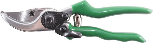 Bypass secateurs with a non-clogging telescopic spring and single-handed locking mechanism.