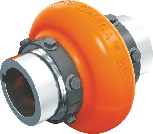 Rexnord Omega couplings are non-lubricated, material-flexing couplings utilising a specially formulated polyurethane material engineered for maximum durability, strength and fatigue resistance. The flex element is designed to split in half, allowing simplified assembly and disassembly. Interchangeable hubs allow for reduced inventory. High misalignment capacity accommodates unavoidable misalignment with low reactionary forces. Torsionally soft flex element cushions shock loads and vibration extending equipment life. Polyurethane flex element does not require lubrication. Polyurethane-to-metal bond eliminates assembly and slippage problems associated with mechanically clamped designs.