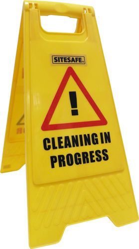 Free-standing, A-frame folding sign with slip hazard symbol on one side and cleaning in progress symbol on the reverse in black